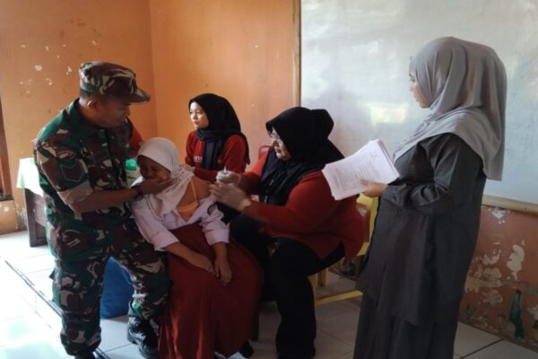Blitar – Babinsa Desa Suruhwadang Koramil 0808/10 Kademangan Serma Abdul Manan turut serta membantu memantau jalannya kegiatan vaksin Difteri dan…