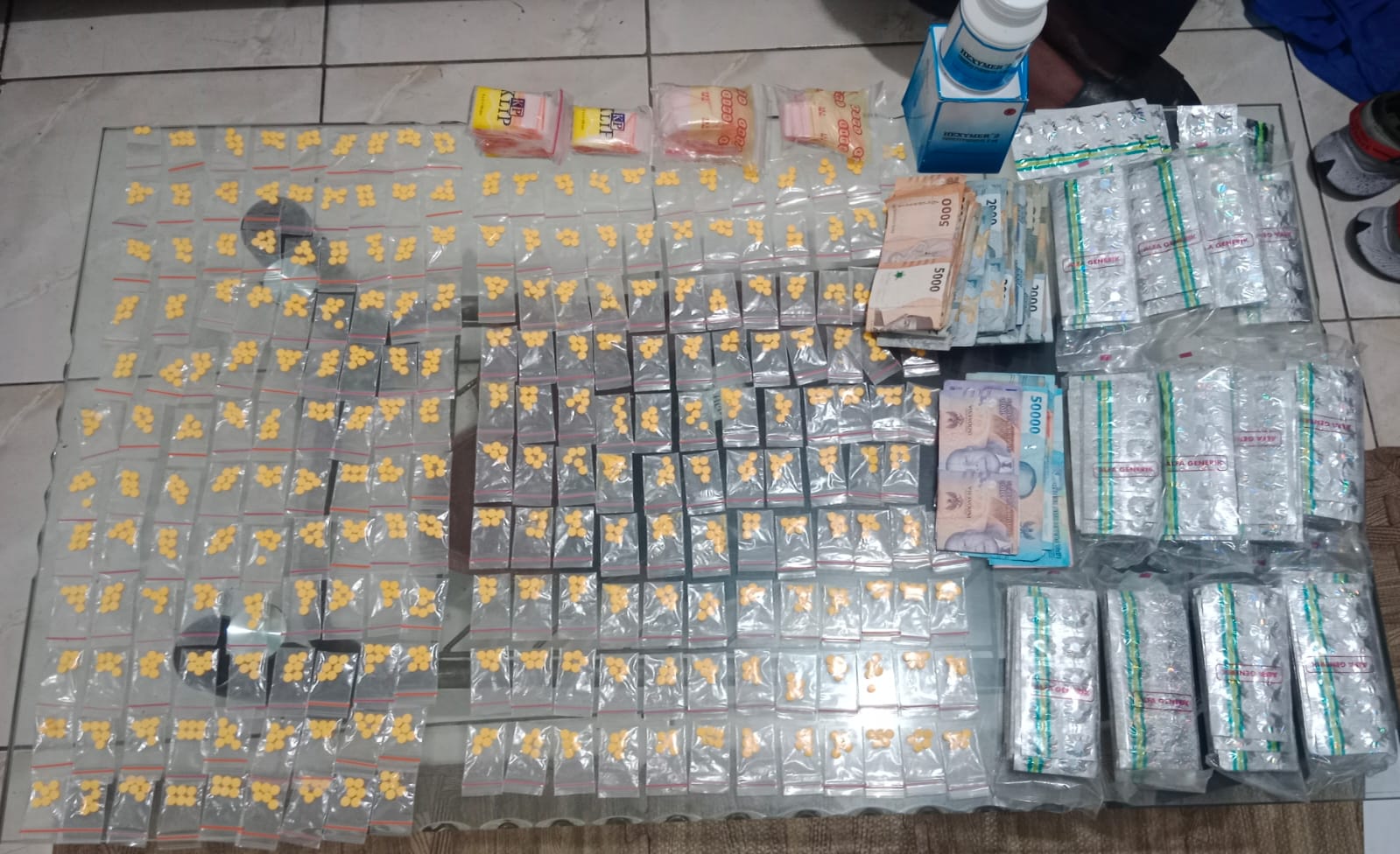 Petugas menggeledah kedua pelaku dan dari tangan kedua pelaku petugas mendapati barang bukti 124 butir Tramadol, 64 butir Eximer, uang tunai penjualan sebesar Rp.279,000, -, 2 unit HP merk Samsung dan Redmi.
