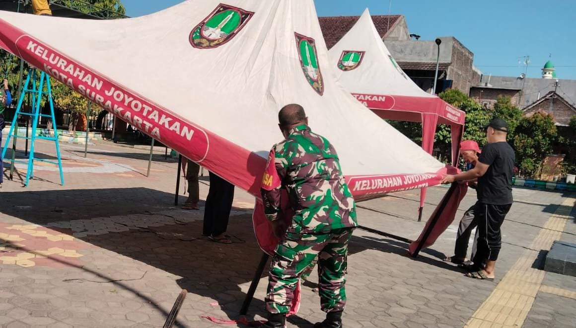 VN-24, Surakarta, Babinsa Joyotakan Koramil 03 Serengan Kodim 0735 Surakarta Serka Rumbawa dan Bhabinkamtibmas Aipda Fajar dan Linmas melaksanakan kegiatan Pelatihan Pemasangan Tenda Darurat antisipasi bencal bertempat di taman cerdas Joyotakan Serengan Kota Surakarta, 19/09/2025