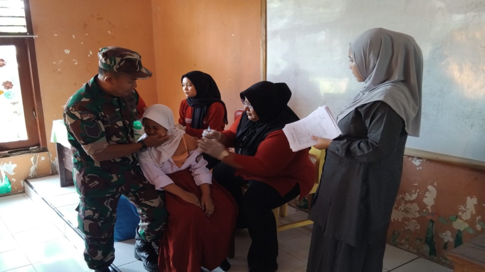Blitar – Babinsa Desa Suruhwadang Koramil 0808/10 Kademangan Serma Abdul Manan turut serta membantu memantau jalannya kegiatan vaksin Difteri dan Anti Tetanus yang dilaksanakan di SDN 1 Suruhwadang Kecamatan Kademangan Kabupaten Blitar, Selasa (23/9/2025). Kegiatan ini diikuti sekitar 60 siswa-siswi sebagai peserta vaksin.