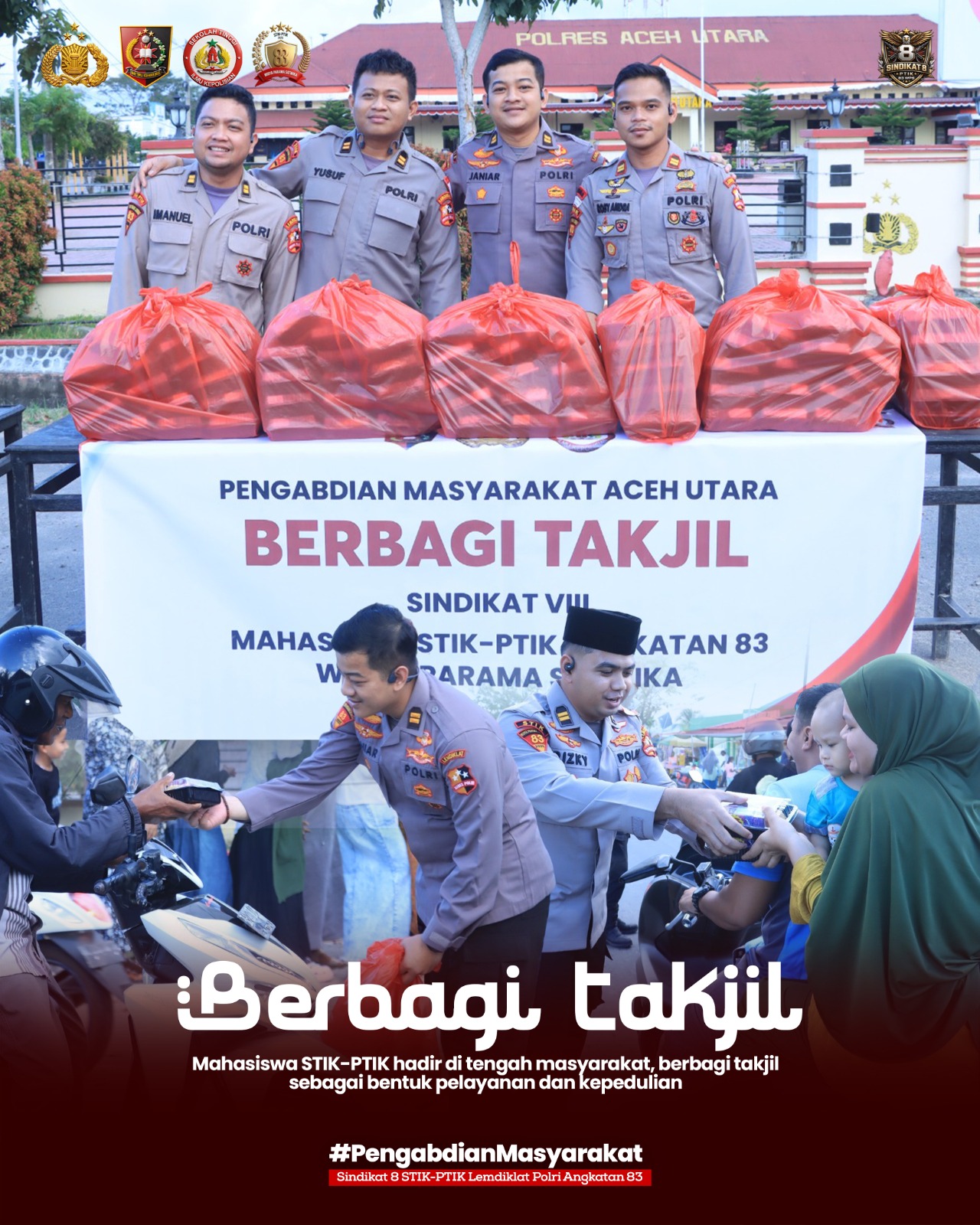 VN-24, Aceh Utara – Dalam rangka pelaksanaan Pengabdian Masyarakat (Dianmas) di wilayah Polres Aceh Utara, Mahasiswa S1 STIK Lemdiklat Polri Angkatan ke-83/WPS melaksanakan kegiatan sosial berupa pembagian ta’jil kepada masyarakat pada Jumat, 27 Februari 2026, pukul 17.00 WIB, bertempat di Polres Aceh Utara.