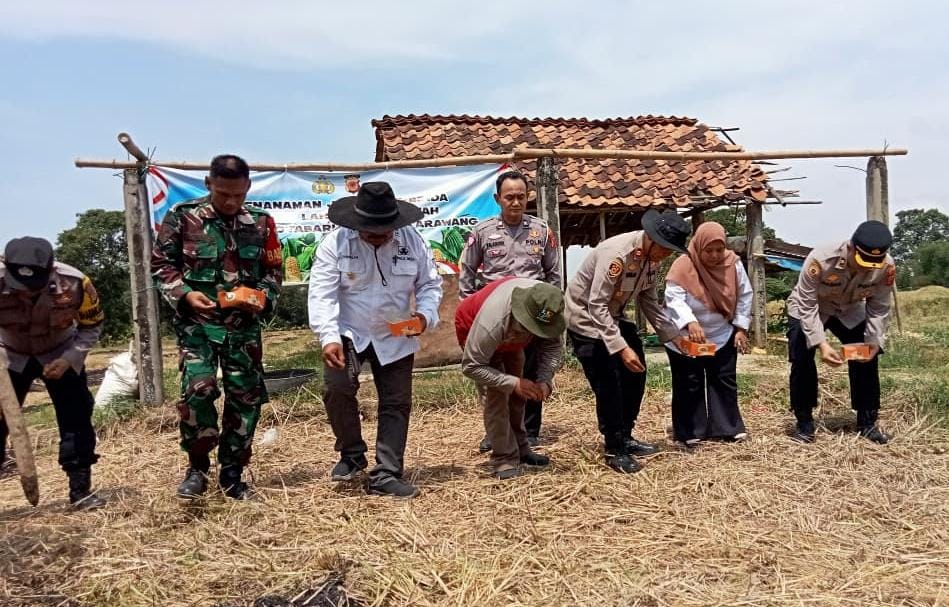 VN-24, Karawang – Kapolsek Kotabaru Iptu Suherlan SH bersama Kades Pangulah Baru melaksanakan kegiatan tanam jagung Hibrida di lahan LBS bertempat di sengon RT 02/04 Desa Pangulah baru