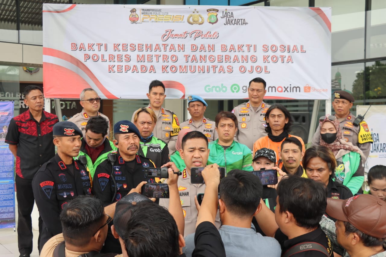 VN-24, Kota Tangerang – Polres Metro Tangerang Kota menggelar kegiatan Jumat Peduli berupa bakti kesehatan dan bakti sosial bersama komunitas ojek online (Ojol), Jumat (19/9/2025) pagi. Kegiatan yang dipusatkan di Mako Polres Metro Tangerang Kota ini diikuti sekitar 100 orang pengemudi Ojol dengan penuh antusias.