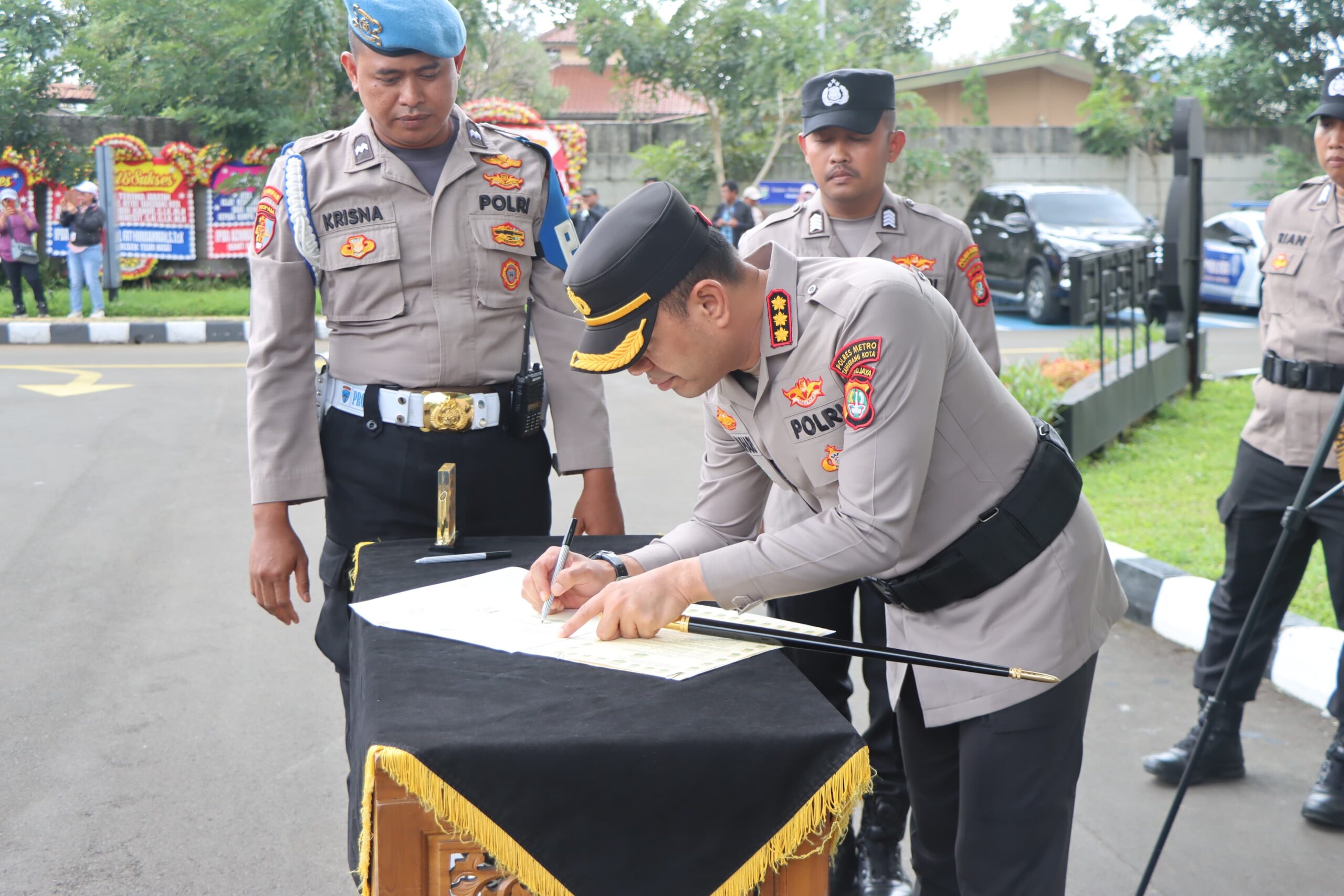 Upacara sertijab dipimpin langsung oleh Kapolres Metro Tangerang Kota, Kombes Pol. Dr. Raden Muhammad Jauhari, S.H., S.I.K., M.Si., serta dihadiri para pejabat utama, kapolsek jajaran, dan personel Polres maupun Polsek.