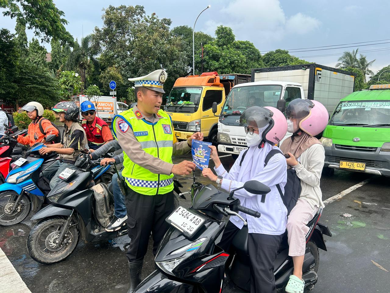 Dalam pelaksanaannya, personel satlantas memberikan imbauan secara langsung kepada para pengendara yang berhenti di lampu merah, sekaligus mengingatkan pentingnya mematuhi aturan lalu lintas demi keselamatan bersama.