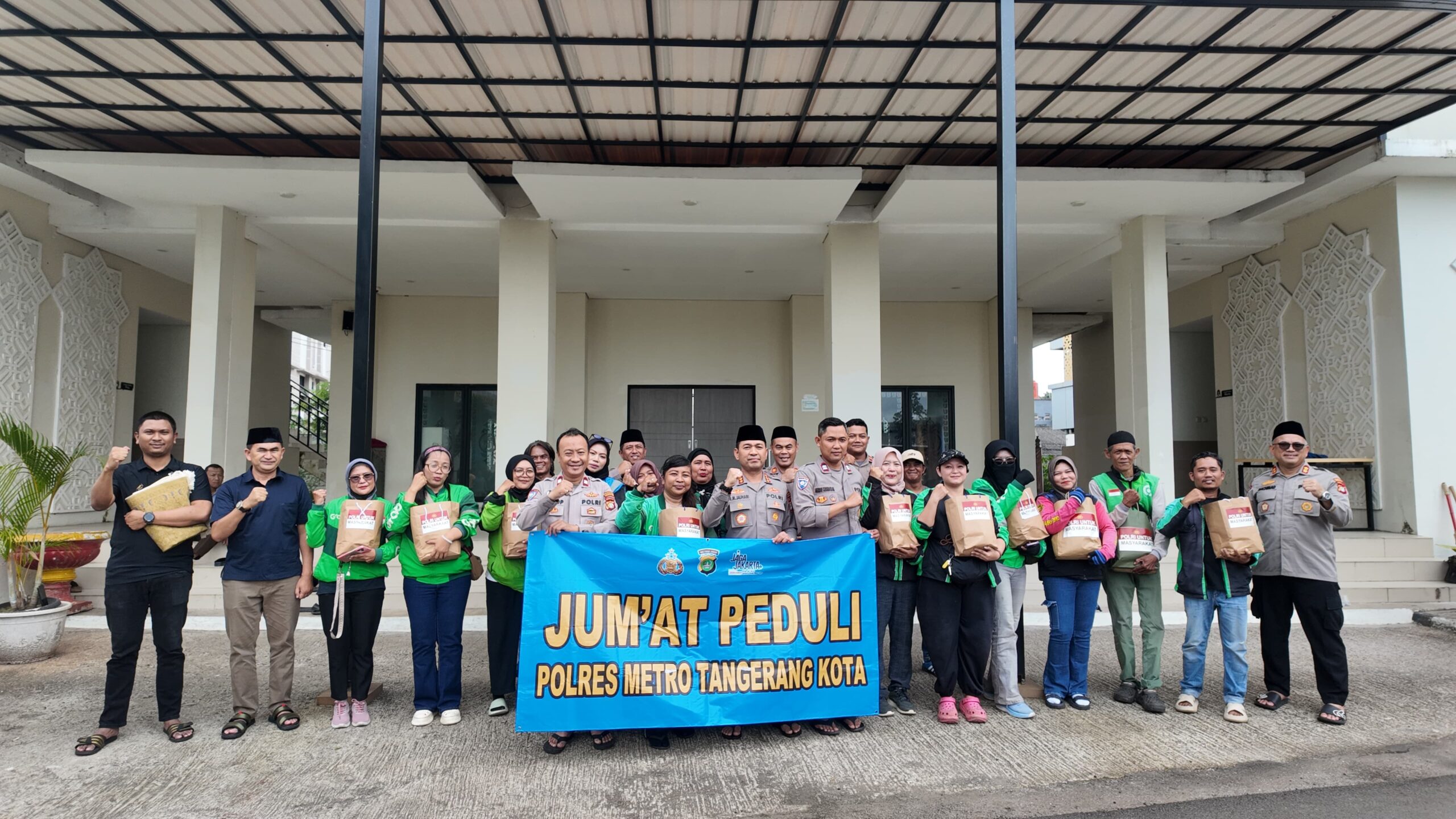 VN-24, Kota Tangerang – Polres Metro Tangerang Kota menggelar kegiatan Jumat Peduli bersama komunitas ojek online (ojol) di halaman Masjid Al Fatah, Jumat (27/3/2026).