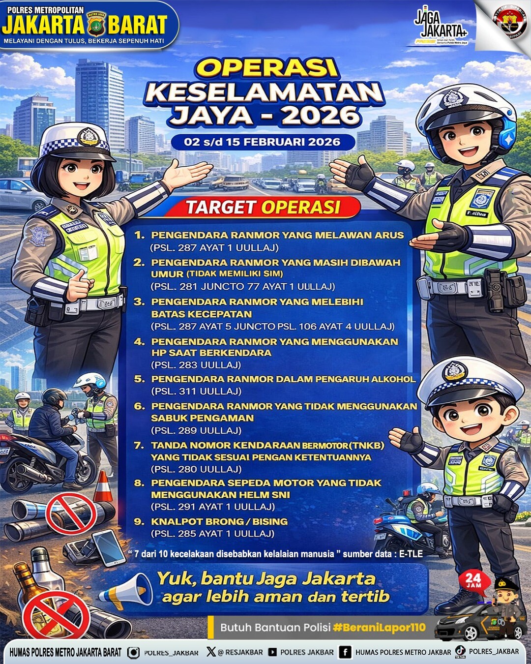 Berdasarkan informasi yang dilansir dari akun Instagram resmi @polres_jakbar, dalam Operasi Keselamatan Jaya 2026, Ditlantas Polda Metro Jaya memfokuskan penindakan terhadap sembilan pelanggaran prioritas yang kerap terjadi di jalan raya, yakni melawan arus, pengendara di bawah umur atau tidak memiliki SIM, melebihi batas kecepatan, menggunakan handphone saat berkendara, berkendara dalam pengaruh alkohol, tidak menggunakan sabuk pengaman, penggunaan TNKB tidak sesuai ketentuan, tidak menggunakan helm SNI, serta penggunaan knalpot bising atau brong.