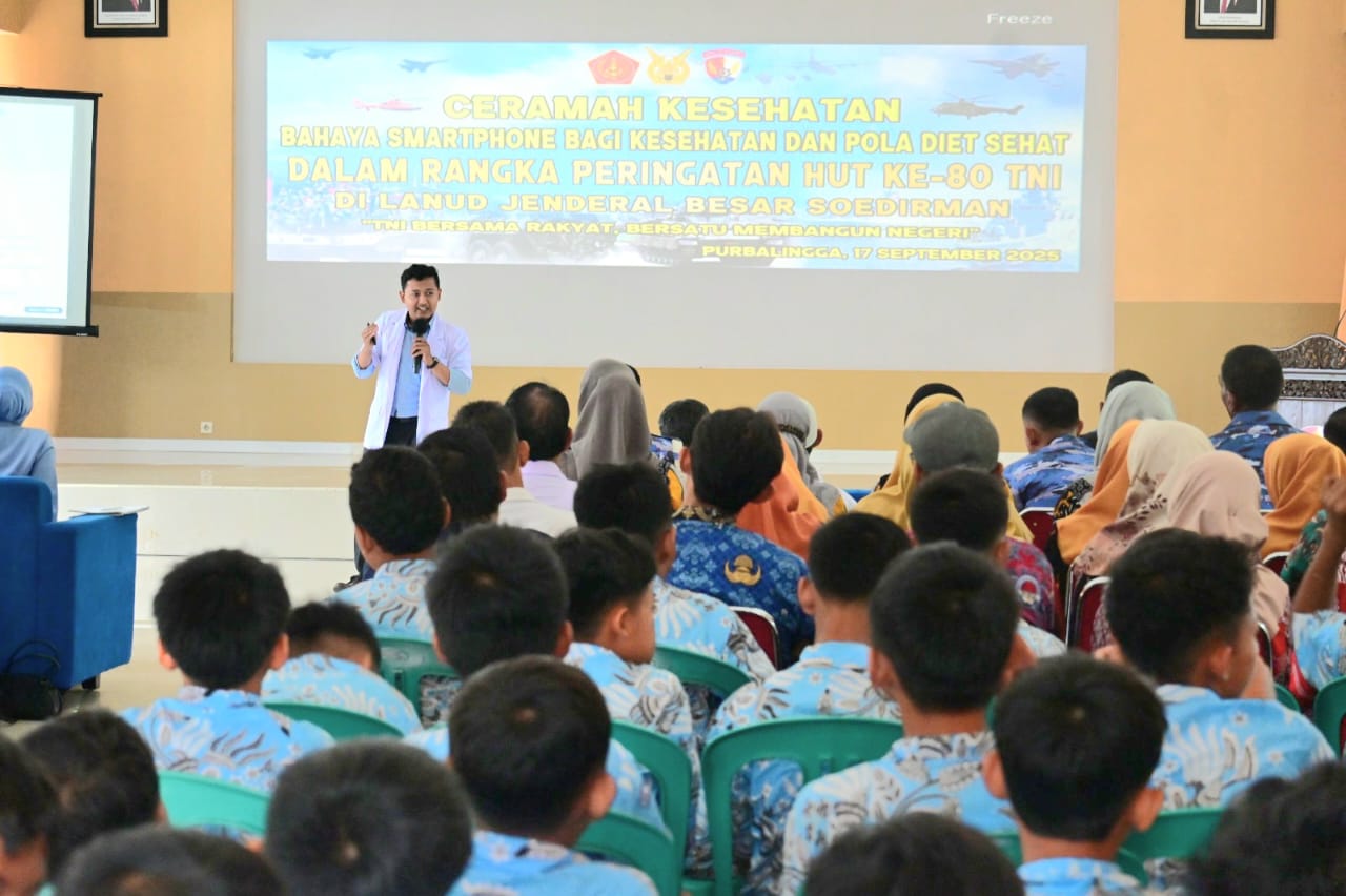 VN-24,Purbalingga – Lanud Jenderal Besar Soedirman menggelar ceramah kesehatan, tentang bahaya smartphone bagi kesehatan dan pola hidup sehat, dalam rangka peringatan HUT Ke-80 Tentara Nasional Indonesia (TNI), sebagai narasumber dr. Fakhry M. Lutfi dari RS. Emanuel dan Kakes Lanud J.B. Soedirman, Lettu Kes dr. Edwin Oka Mustofa. Kegiatan dilaksanakan di Gedung Serba Guna Soewarno Lanud J.B. Soedirman, Purbalingga. Rabu (17/09/2025).