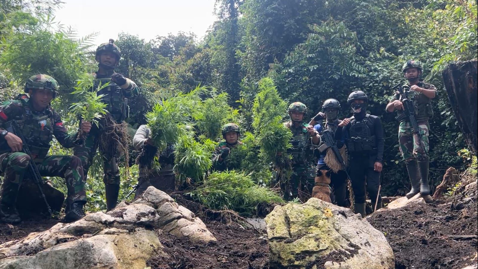 VN-24, Oksibil, Pegunungan Bintang — Patroli Keamanan oleh Satgas Yonif 751/VJS dan Satgas Intel lainnya dipimpin langsung oleh Dansatgas Yonif 751/VJS, Letkol Inf Erwan Harliantoro ke arah Hutan Dusun Ngutok, Kampung Kabiding, Distrik Oksibil kembali menghasilkan penemuan ladang ganja dengan jumlah Pohon yang tertanam sekitar 740 batang.(Selasa,21/10/2025)